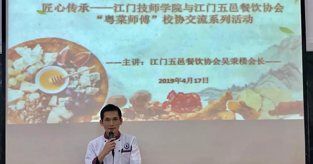 江门市技师学院现代服务系烹饪专业是学院重点建设专业之一,于2000年开设至今,经过19年的建设与发展,取得了良好成效,近年来每年招生人数持续上涨。目前,烹饪专业有9位专业教师,其中广东烹饪名师1人,江门市粤菜师傅烹饪名师1人,江门市名厨1人,江门市技术能手3人,中式烹调高级技师2人,中式面点高级技师3人,西式面点技师3人,高级营养师3人,高级考评员3人。受邀过来本院做讲座的吴秉楼先生是江门五邑餐饮行业协会的会长,该协会有会员单位310家,专业厨师3500多人。通过校协的全方位合作,共同开展教学、培训、竞赛、交流等活动,推广粤菜文化,传承侨乡厨艺。