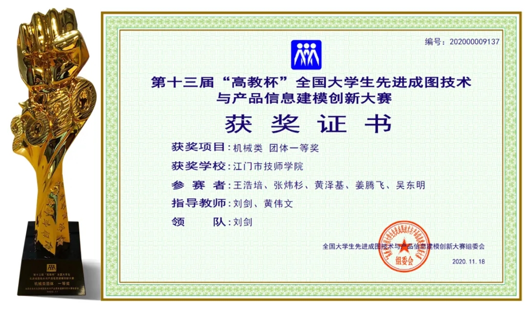 由教育部高等学校工程图学教学指导委员会、教育部高等学校工程图学课程教学指导分委员会、中国图学学会制图技术专业委员会、中国图学学会产品信息建模专业委员会联合举办,2020年第十三届“高教杯”全国大学生先进成图技术与产品信息建模创新大赛于近日落下帷幕。江门市技师学院张炜杉、黄泽基、王浩培、姜腾飞、吴东明等五位同学,分别荣获机械类建模项目“个人一等奖”、机械类3D打印项目“一等奖”和机械类“团体一等奖”。刘剑、黄伟文两位教练荣获“优秀指导教师”荣誉称号。