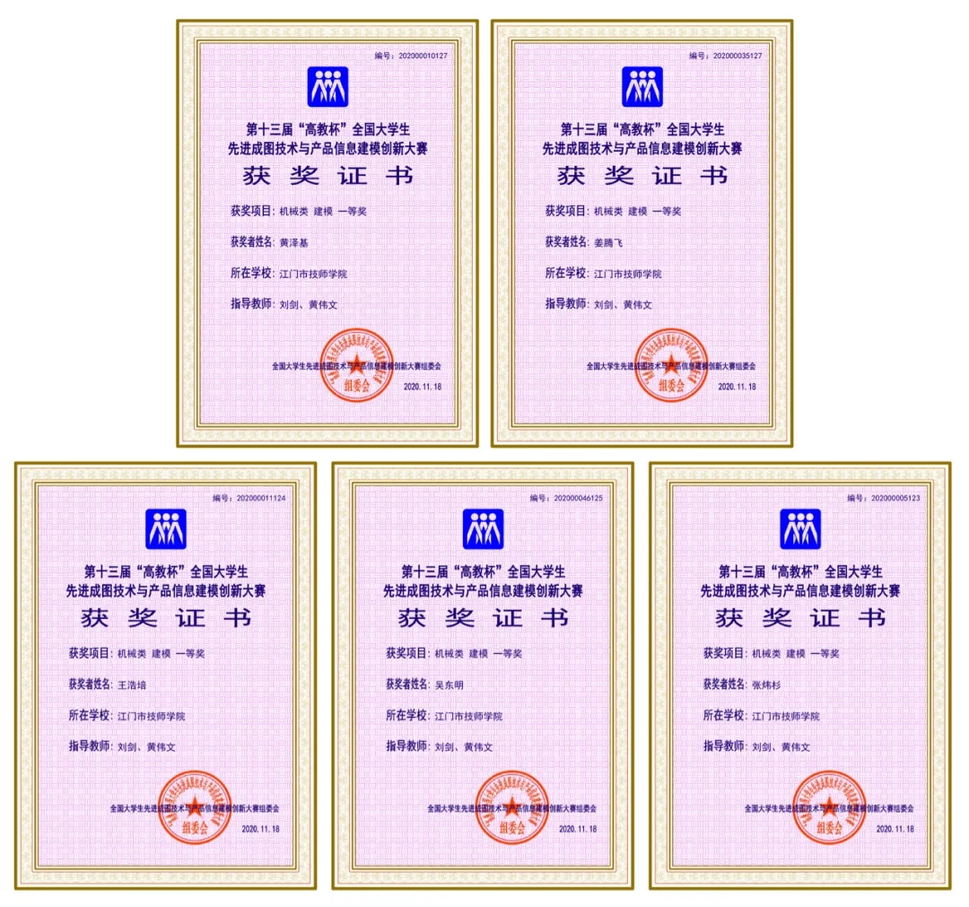 张炜杉、黄泽基、王浩培、姜腾飞、吴东明分别荣获机械类建模项目“个人一等奖”
