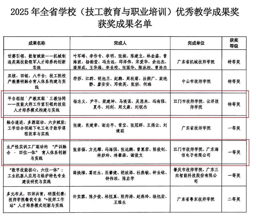 近日,广东省人力资源和社会保障厅、广东省教育厅联合发布了《关于表彰全省学校优秀教学成果奖(基础教育与职业教育类)的决定》,江门市技师学院凭借卓越的教学成果和创新能力,在众多参评院校中脱颖而出,荣获特等奖1项、一等奖1项的优异成绩,充分展示了学院在技工教育领域的深厚底蕴与创新实力。