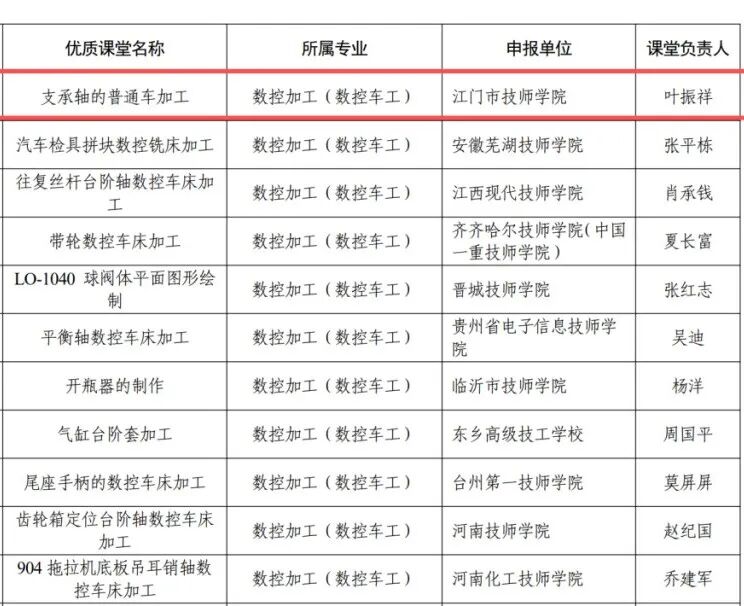 近日,人力资源社会保障部办公厅正式公布了“全国技工院校工学一体化技能人才培养模式优质课堂”名单,江门市技师学院数控加工专业“支承轴的普通车加工”课堂(负责人:叶振祥)成功入选。