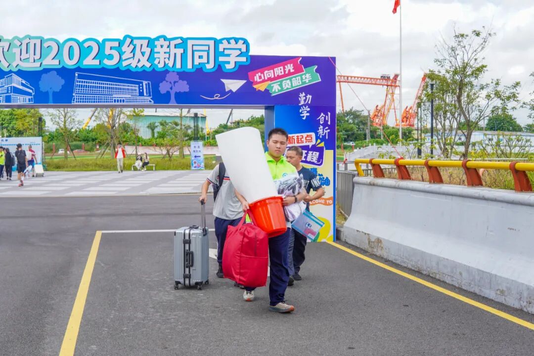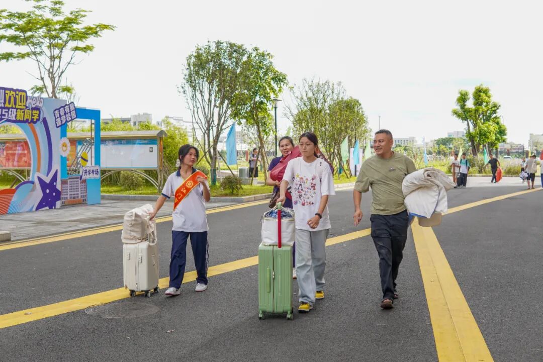 迎新现场呈现出一派忙碌而有序的景象。学院各部门成员各司其职,义工队志愿者穿梭往来搬运行李,新生班主任全程耐心办理手续,学长学姐们化身"领航员"分享校园生活经验,形成了全方位、无缝隙的服务网络。校园内设置的清凉补给站、志愿者服务区等暖心点位,更让师生家长感受到细致关怀。"从车站接送到宿舍安顿,每个环节都透着用心,把孩子交给这样的学校我们特别放心!"一位来自鹤山的家长竖着大拇指说道,话语中满是对学校服务的认可。