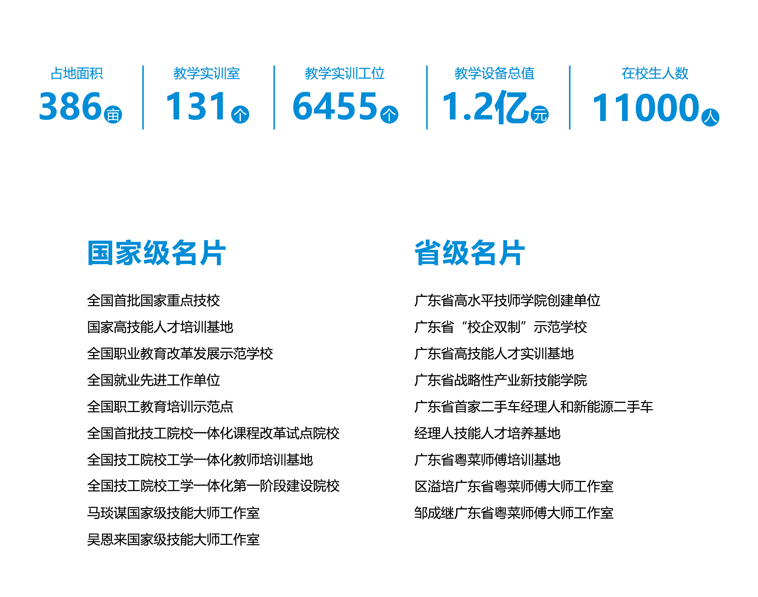 学院是全国首批国家级重点技校、技师学院、国家高技能人才培训基地、全国一体化教改示范单位、全国就业先进工作单位、全国职工教育培训示范点、广东省“校企双制”示范校、广东省高水平技师学院创建单位。
