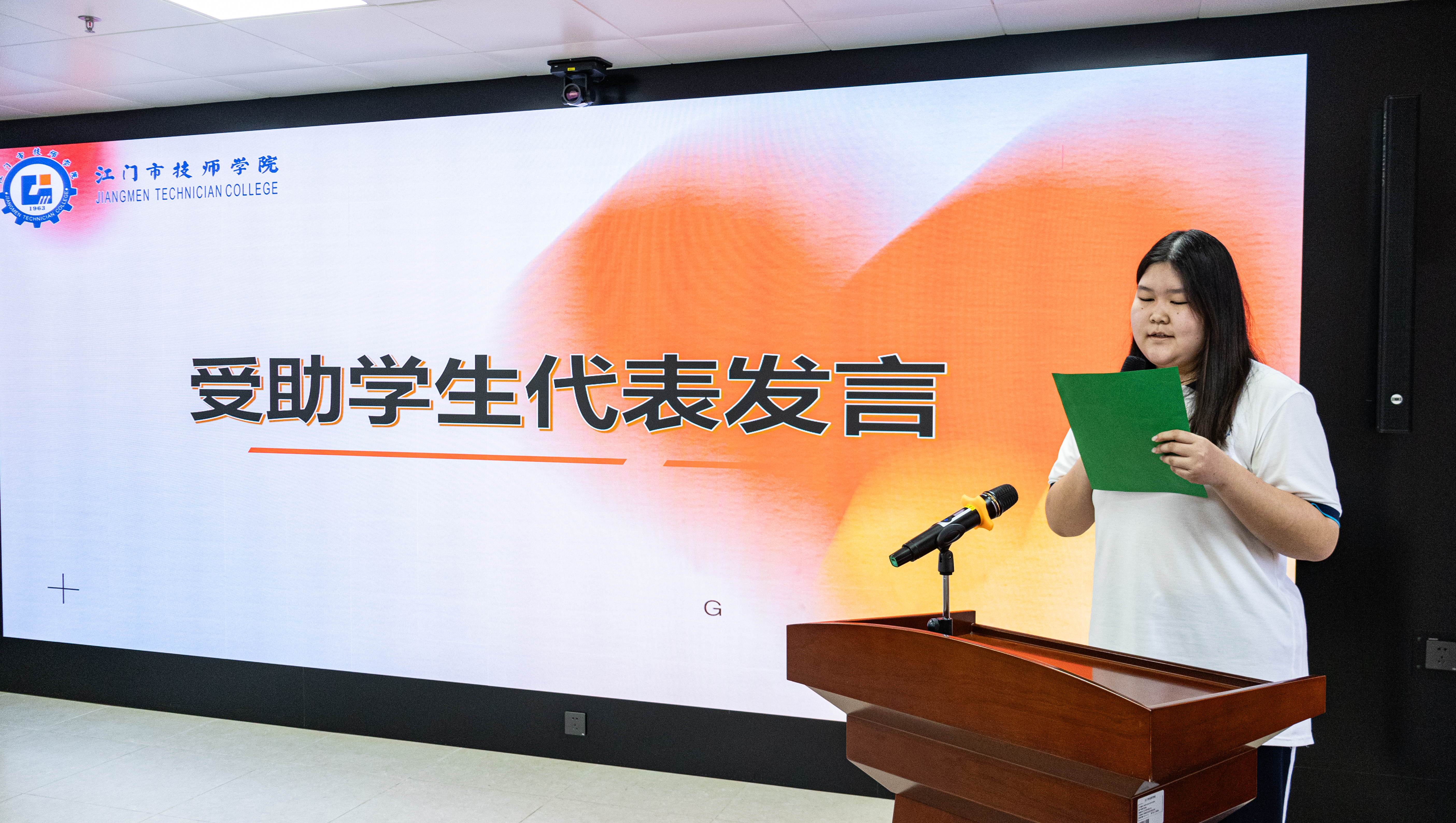 江门市技师学院党委书记王戟同志代表学院,向市老年学学会及外海爱心人士的善心义举致以最诚挚的感谢。她指出,这份跨越年龄的关爱,不仅为学子们缓解了经济压力,更传递了社会正能量,是“大思政课”最生动的实践教材。王戟书记嘱托全体受助学子,要倍加珍惜这份沉甸甸的关爱,以爱心人士为榜样,潜心钻研技能、锤炼过硬本领,以“技能报国”的志向砥砺前行;要常怀感恩之心,铭记社会各界的深情厚谊,将这份关爱转化为立志成才、服务社会的强大动力,用优异的成绩和实际行动回报爱心人士的殷切期望、学院的悉心培养与社会的深切关怀。