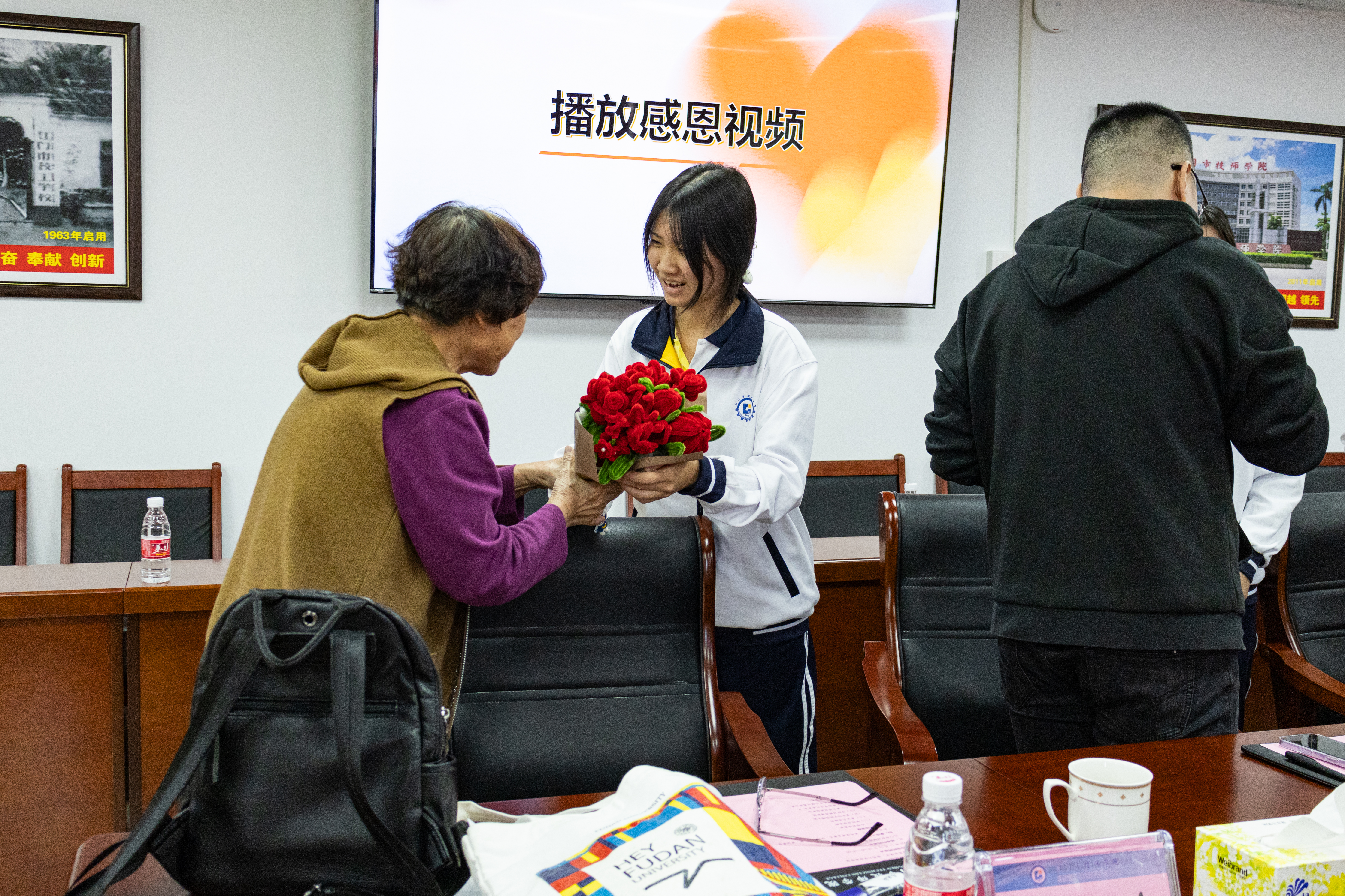 仪式现场氛围温馨而庄重。市老年学学会向学院郑重捐赠奖助学金支票,学院为爱心单位回赠纪念牌匾,以此铭记这份大爱担当。受助学生代表向兰同学代表全体获奖学子宣读感谢信,字里行间满含感恩之情与奋进决心。全体受助同学还精心自制花束,并录制了暖心感恩视频,用最质朴的方式表达对爱心人士慷慨相助的由衷谢意,承诺将不负关爱、勤奋求学,未来以过硬技能回馈社会、建设祖国。