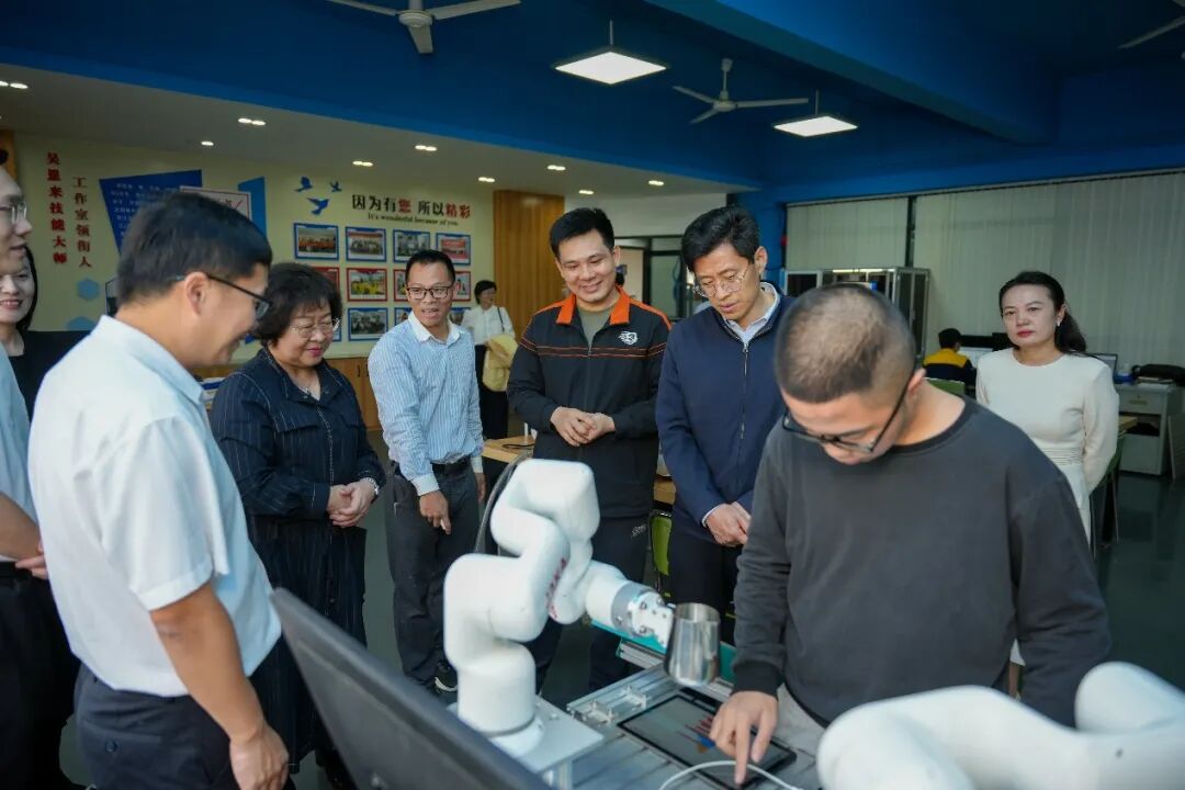 听取汇报后,调研组一行深入学院,实地考察办学环境与人才培养情况,重点走访了德昌电机产训结合工作站、中德诺浩汽车学院、莱茵工业机器人培训考试中心、产训结合实践基地和西门子国际认证中心等教学实训场所。