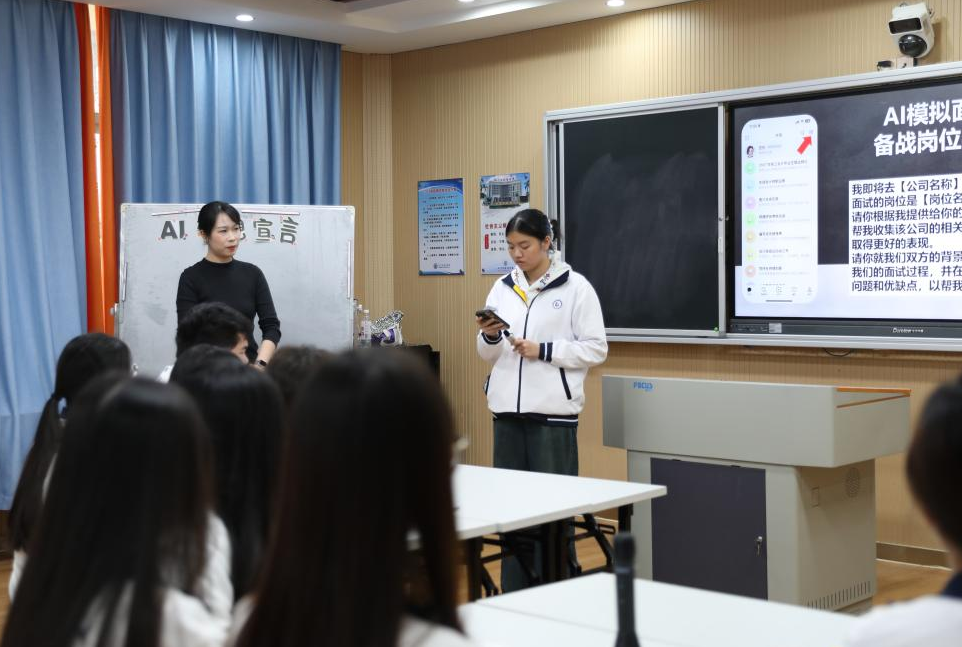 “对话未来”环节聚焦岗位实习面试准备,陈老师向学生介绍AI在求职中的实用价值,指导学生用豆包、KIMI AI开展模拟面试,通过设定角色、语音通话实训,让同学们在沉浸式体验中熟悉面试流程、打磨应答技巧。随后邀请一名同学上台展示模拟面试过程,模拟问答场景并获取复盘建议,其出色表现赢得全场掌声,也为其他同学提供了宝贵的实践参考。