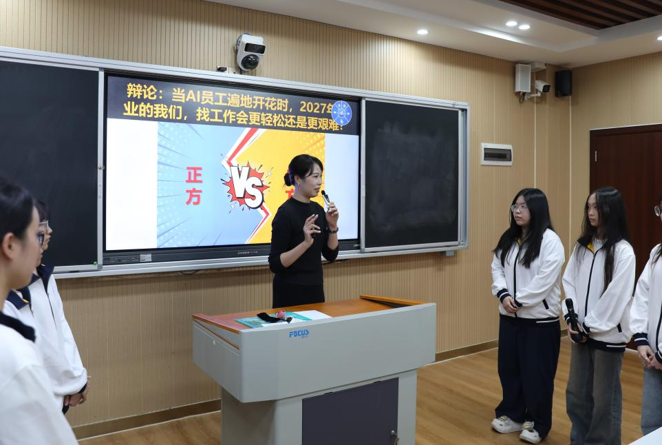 “思辨未来”环节中,通过使用陈老师人声的AI面试官作为导入,引领学生先探讨“AI克隆人声利弊”。随后,同学们分为正反方围绕“2027年毕业时,AI员工遍地开花会让找工作更轻松还是更艰难?”这一核心议题展开激烈辩论。辩论结束后,师生共同探讨问题本质,提炼出人类对比AI拥有的独特想象力、情感共情能力等不可替代性,让学生深刻认识到,AI是辅助者而非替代者,自身核心能力的提升才是立足之本。