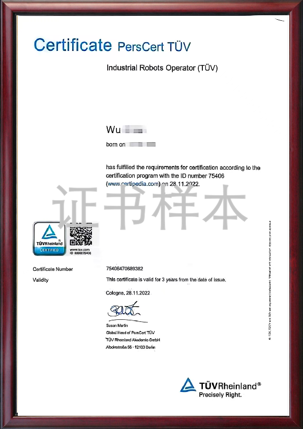 德国莱茵TÜV PersCert注册工业机器人操作员认证是全球制造业广泛认可的专业资格证书。学员持有该证书,代表具备了符合国际标准的工业机器人操作、编程与维护能力,为学员在智能制造领域的职业发展提供了强有力的国际通行证。
