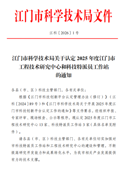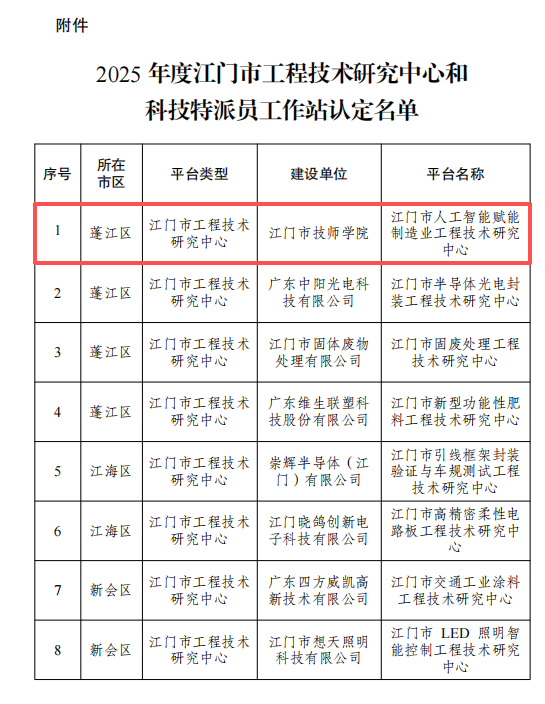 近日,江门市科学技术局正式公布2025年度江门市科技创新平台认定名单。我院申报的“江门市人工智能赋能制造业工程技术研究中心”与“江门市技师学院科技特派员工作站”双双获得认定,标志着学院在科技创新平台建设与服务地方产业发展方面迈上新台阶。