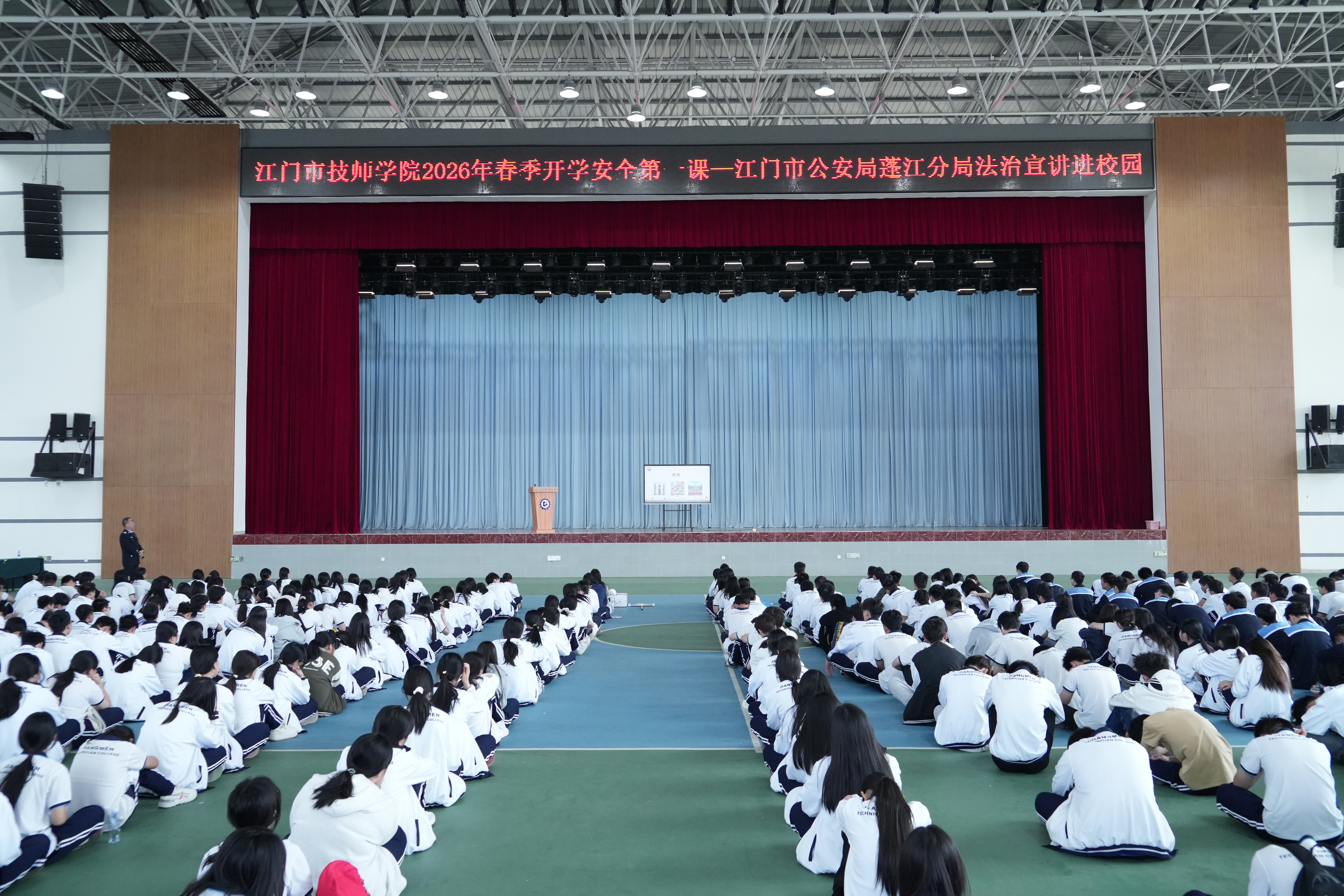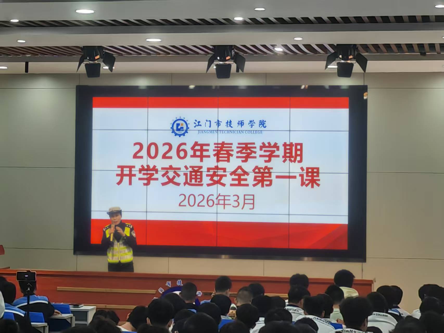 春启新程,安全先行。为筑牢新学期校园安全防线,增强学生法治意识与自我保护能力,近日,学院分别在荷塘和潮连校区开展2026年春季学期开学安全第一课,特邀江门市公安局蓬江分局骨干民警进校园开展法治安全专题宣讲,为师生送上实用“安全大礼包”。分局刑侦、禁毒、情报指挥、交警等部门民警出席,学院师生代表现场聆听。