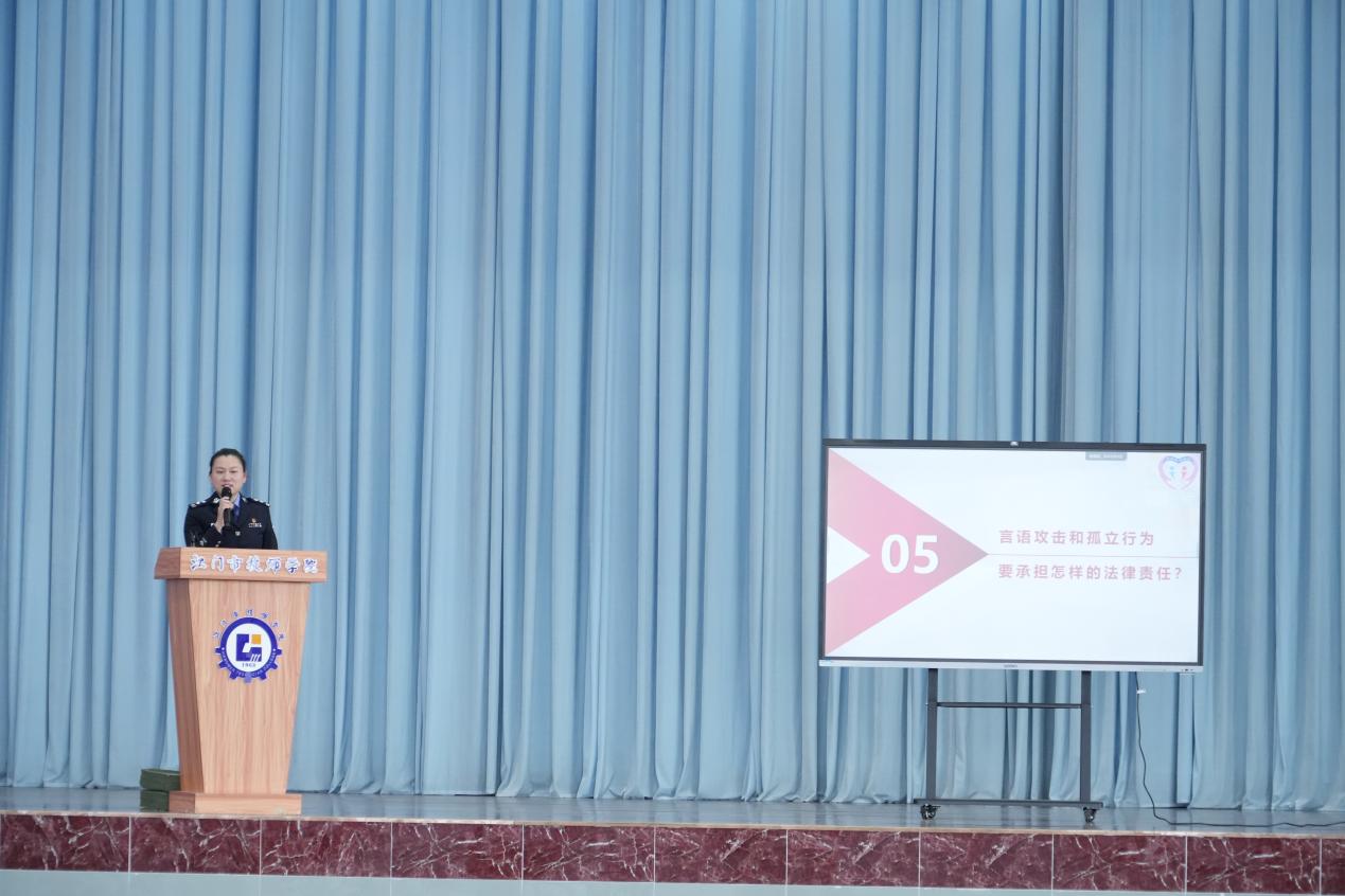 刘剑南警长以《对校园欺凌说不》为主题,解读肢体冲突、言语侮辱、网络暴力等欺凌形式,阐明欺凌行为的法律后果,传授应对方法,倡导大家不做欺凌者、不当旁观者,遇欺凌及时求助,共建和谐校园。
