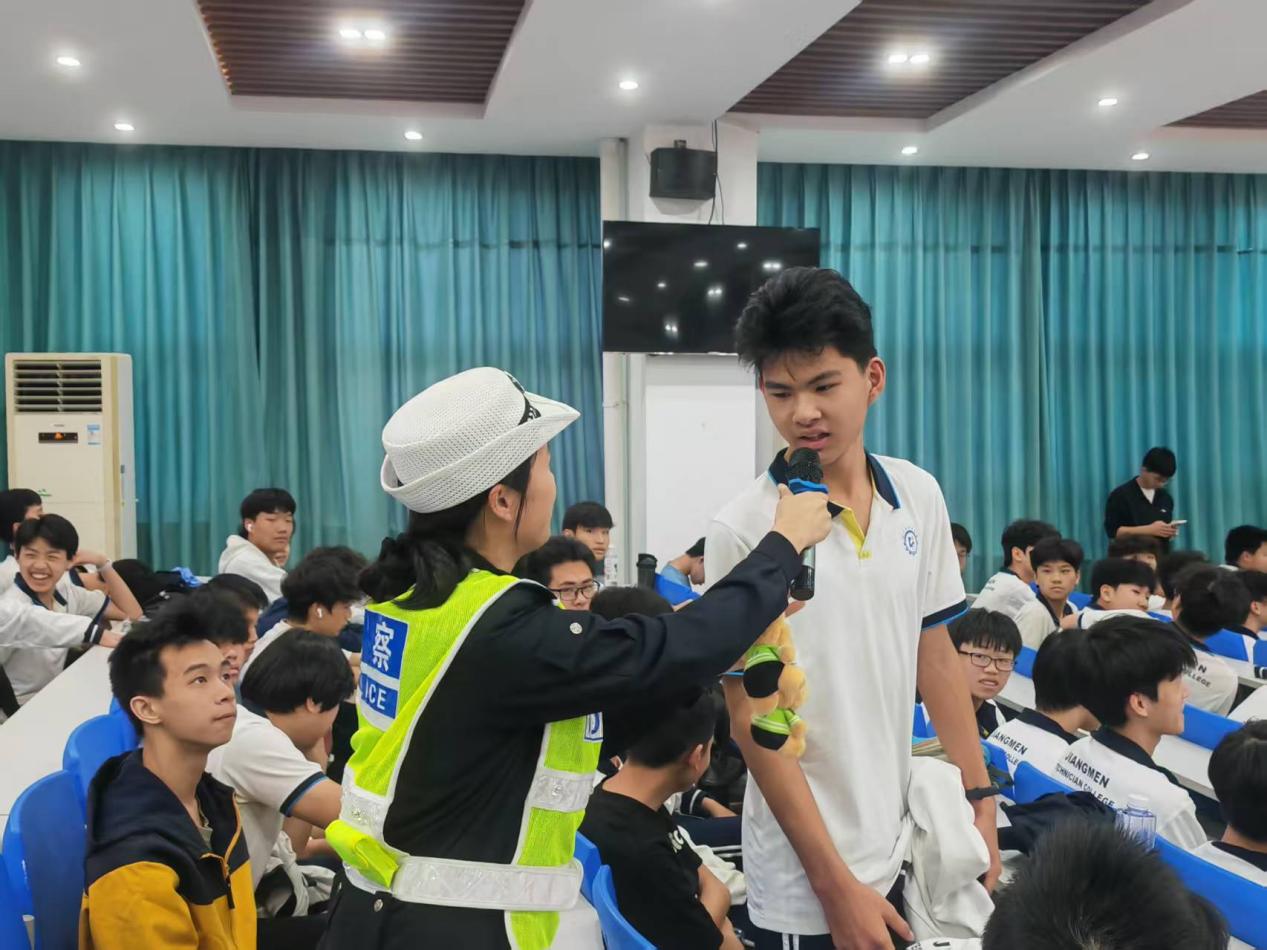 蒋柳警长以《知危险 会避险》普及交通安全知识,通过视频案例警示、互动交流等方式重点讲解戴头盔、靠右行、慢慢开、远离货车盲区规范系好安全带等内容,结合校园周边隐患提醒学生守规则、会避险,平安文明出行。