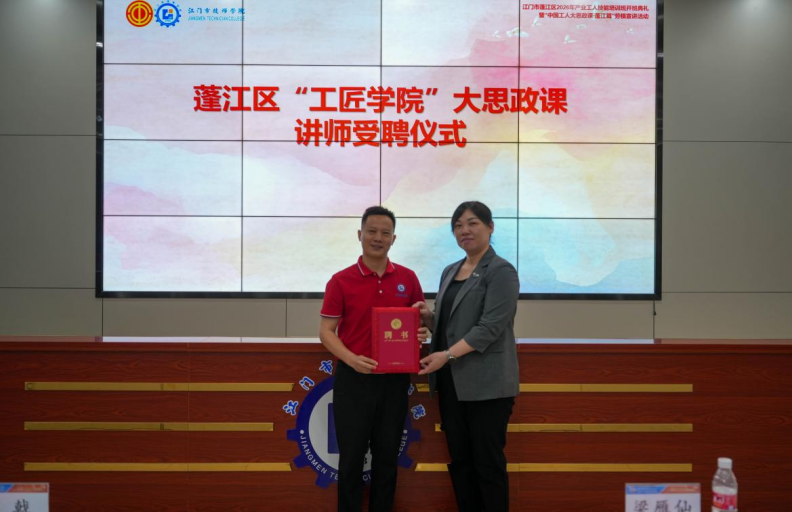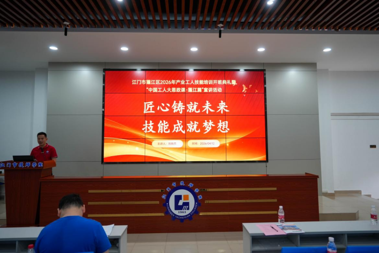 近日,由蓬江区总工会主办、各镇(街)总工会协办、江门市技师学院承办的“蓬江区2026年产业工人技能培训班开班仪式暨‘中国工人大思政课·蓬江篇’劳模宣讲活动”在学院潮连校区举行。蓬江区委常委、宣传部部长梁雁仙,蓬江区人大常委会党组成员、副主任、总工会主席卢永生,学院党委书记王戟等领导出席活动。