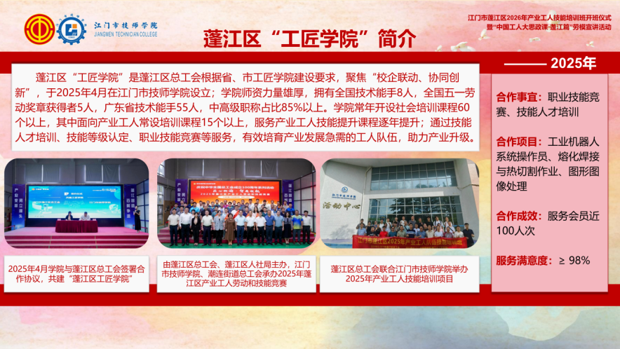 展望未来,学院将继续依托国家高技能人才培训基地、全国职工教育培训示范点等平台,紧扣蓬江区产业发展实际需求,持续优化社会服务项目设置,不断创新服务模式,做好培训组织与教学保障,助力产业工人技能水平全面提升。