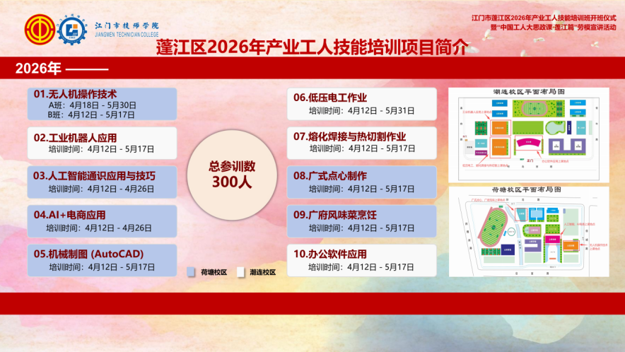 立足蓬江产业发展实际,学院联合区总工会通过需求调研、项目推荐、公开遴选等方式,精准确定无人机操作技术、工业机器人应用技术、AI+电商应用、低压电工作业、熔化焊接与热切割作业、广府风味烹饪、广式点心制作、办公软件应用等10个项目,涵盖传统产业急需工种与新兴技术领域,共吸引近300名产业工人报名参训,充分体现了“产业导向、职工所需、精准赋能”服务原则。