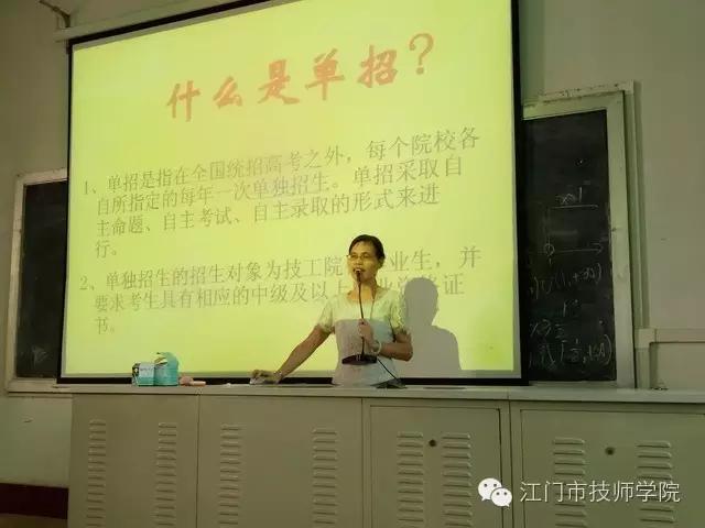 邓美联老师作了单招高考工作汇报,她就天津职业技术师范大学采取单独命题、考试、录取的办法,被录取的技校考生享受普通高考被录取考生的同等待遇,广东省户籍且成绩优异的技校生均可报名参加考试以及参加辅导的考生要注意的事项等方面的问题进行了解答。