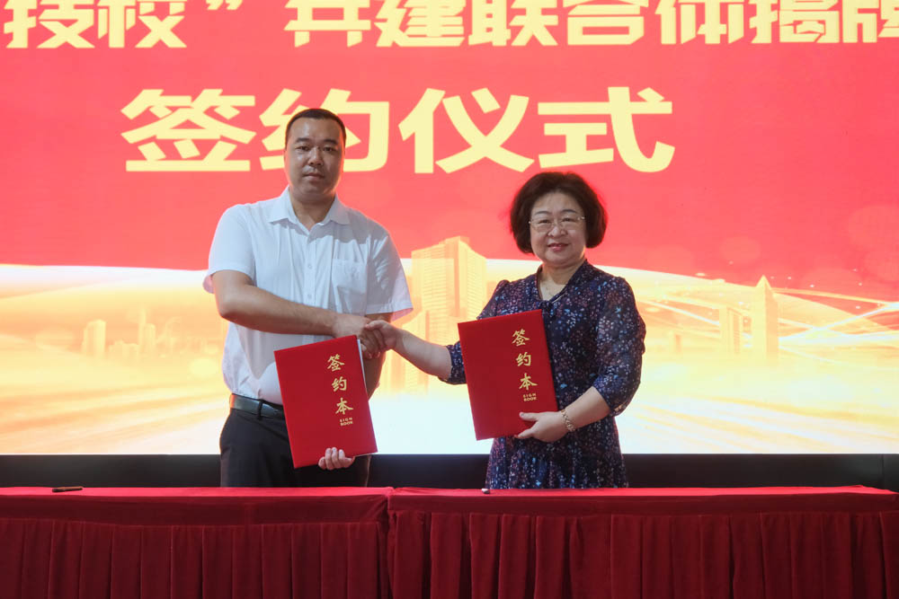 会上,鹤山市人民政府李海权副市长与学院王戟书记分别代表政校双方签订“园区技校•技能人才培育合作”协议,并与鹤山市人社局陈自力局长、吴东明副局长等领导嘉宾共同为“园区技校”共建联合体揭牌。