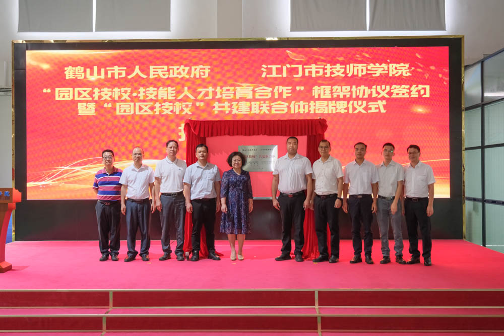 为贯彻省委“1+1+9”工作部署和市委“1+6+3”工作安排,落实江门市“园区技校”三年行动计划,近日学院与鹤山市人民政府举办“园区技校•技能人才培育合作”协议签约暨“园区技校”共建联合体揭牌仪式。这是学院继与恩平市人民政府、蓬江区人民政府及江海区人民政府建立技能人才培养合作关系后进一步推动政校合作的重要举措。鹤山市人民政府党组成员、副市长李海权,鹤山市人社局党组书记、局长陈自力,党组成员、副局长吴东明,鹤山市职业技术学校校长徐秉炬,江门市人社局职业技能鉴定指导中心副主任梁炎均,学院党委书记、院长王戟等领导参加仪式。