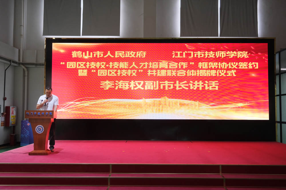 鹤山市人民政府李海权副市长表示,近年来鹤山市政府积极响应“工业振兴”“园区再造”“人才倍增”等工程,持续深入推进“园区技校”项目。本次政校双方共建“园区技校”联合体是深入贯彻江门市委市政府新时期高质量发展战略部署的具体动作,也是鹤山市人民政府与江门市技师学院深入开展“园区技校•技能人才培育”合作的崭新开端。希望双方充分发挥政校合作优势,在专业设置、实训基地建设、产学研合作等方面开展全方位合作,提供多元化高质量的人才技能提升服务,满足鹤山及市技师学院技能人才学习技能、提升技能的迫切需要,共谋政校双赢发展。